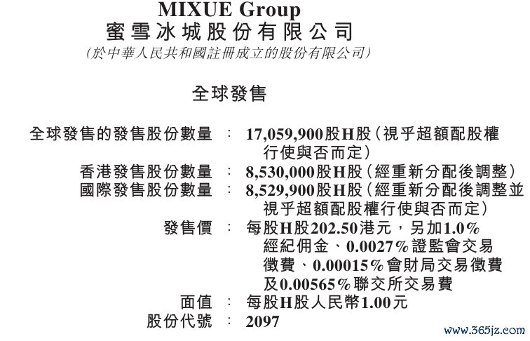 蜜雪集团:IPO最终价格为202.5港元/股蜜雪集团:IPO最终价格为202.5港元/股